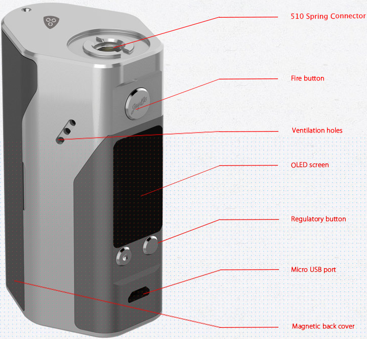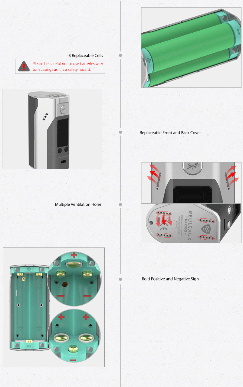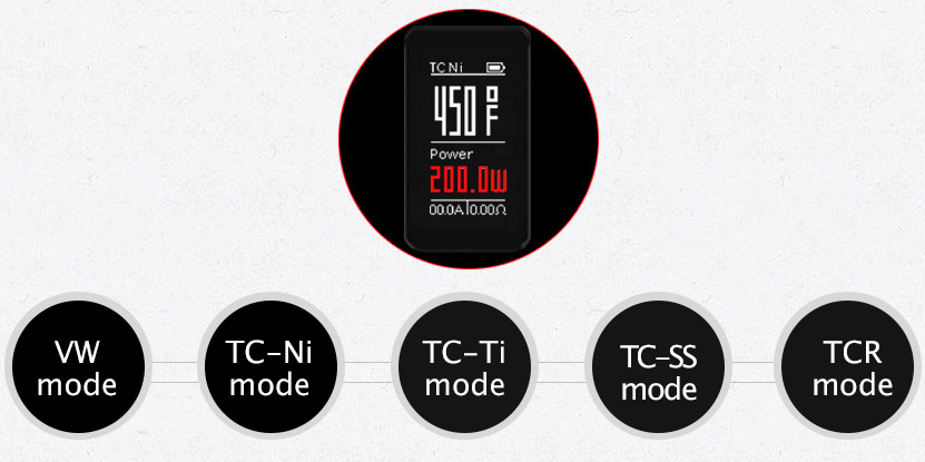 200W High Power Output with Temperature Control System: Powered by three 18650 cells, the device can reach the 200W maximum output. The optional VW/TC-Ni/TC-Ti/TC-SS/TCR mode will provide you with wonderful vaping enjoyment.