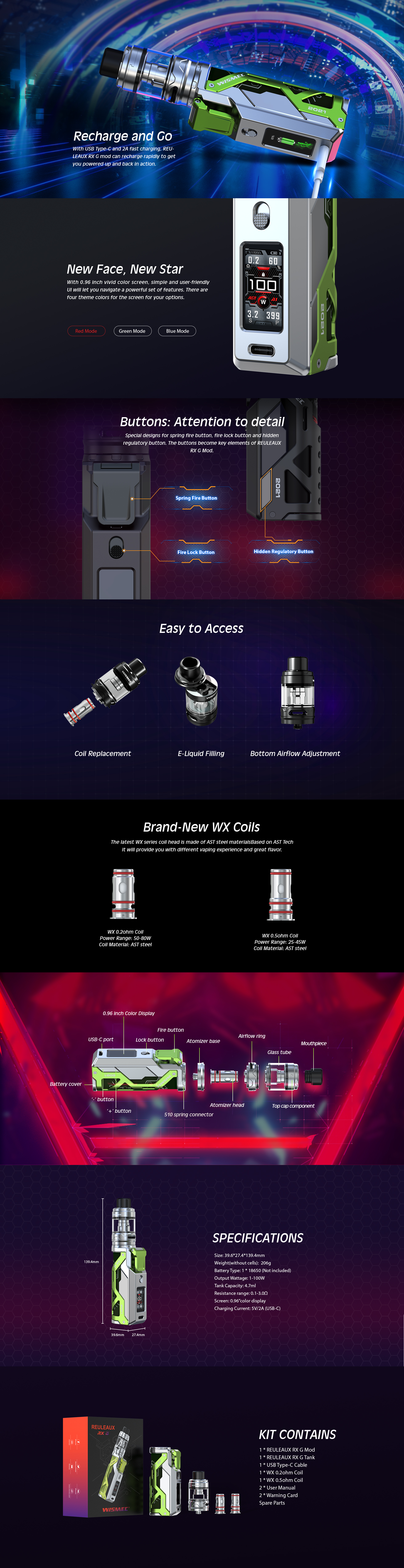 It's been a long time! Combined with the cyberpunk design style and brilliant dazzling light effect, Wismec create a new generation of REULEAUX series--REULEAUX RX G Kit, including REULEAUX RX G box mod and REULEAUX RX G Tank with the innovative AST technology. REULEAUX RX G mod is powered by single external 18650 battery and can reach a max 100W output. Coupled with 0.96 inch color screen, USB-C 2A fast charging and especially the latest AI technology, it will further improve the user experience. REULEAUX RX G tank has the brand-new WX coil, 4.7ml capacity and dual bottom airflow. It will bring you great flavor and long life-span. REULEAUX RX G Kit is always your best choice!