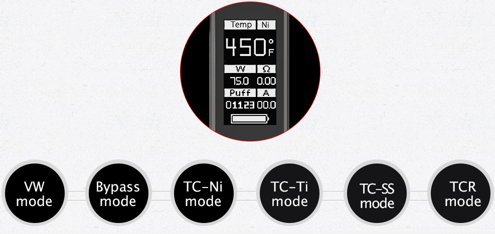 Output Mode: VW/Bypass/TC-Ni/TC-Ti/TC-SS/TCR Mode